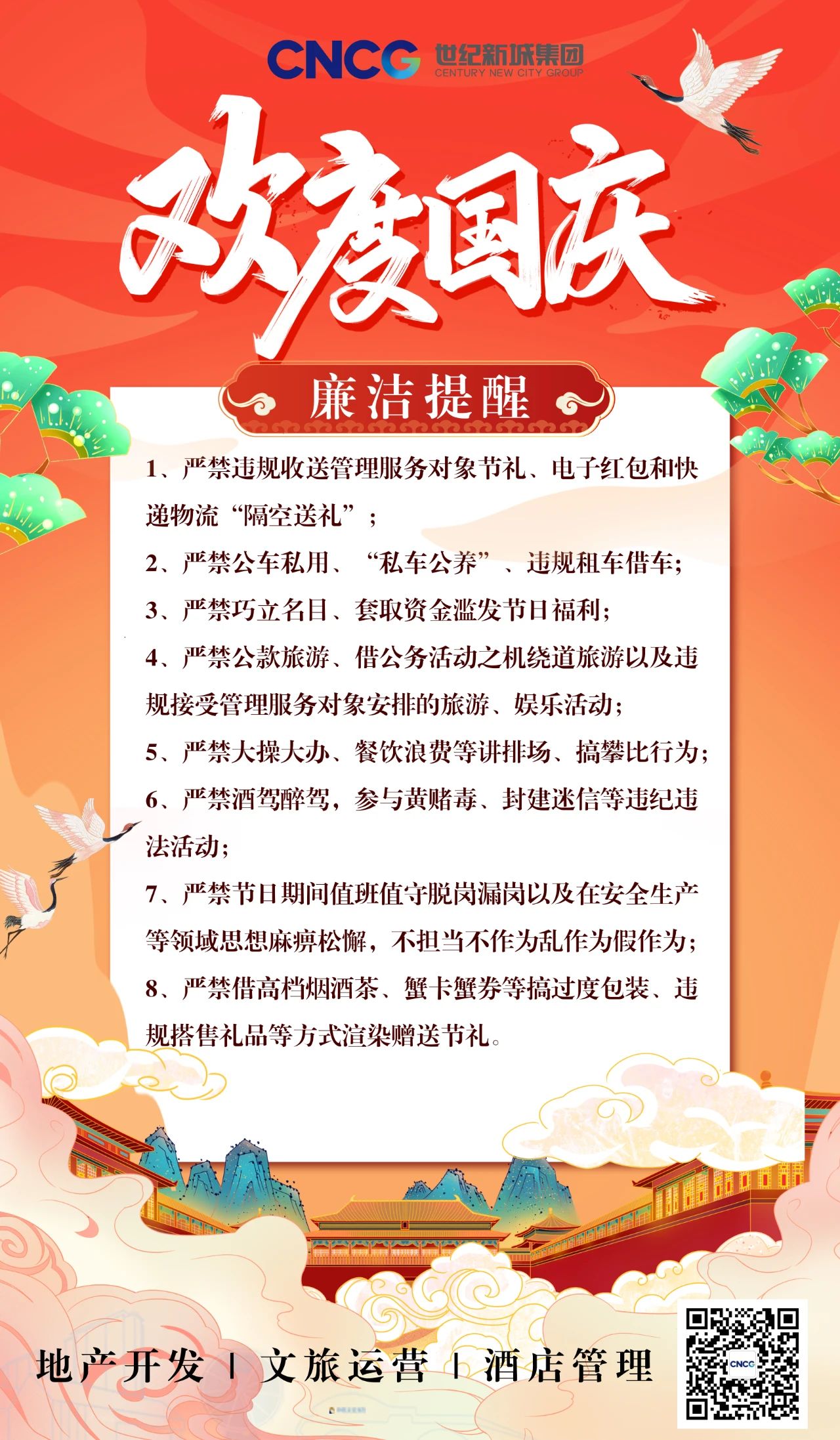 秋風送爽,丹桂飄香。2024年國慶佳節(jié)將至,為深入貫徹全面從嚴治黨工作要求,進一步鞏固落實中央八項規(guī)定精神成果,馳而不息糾治“四風”倡樹新風,積極營造風清氣正的節(jié)日氛圍,世紀新城集團紀委現(xiàn)向全體黨員干部職工作出如下提醒: