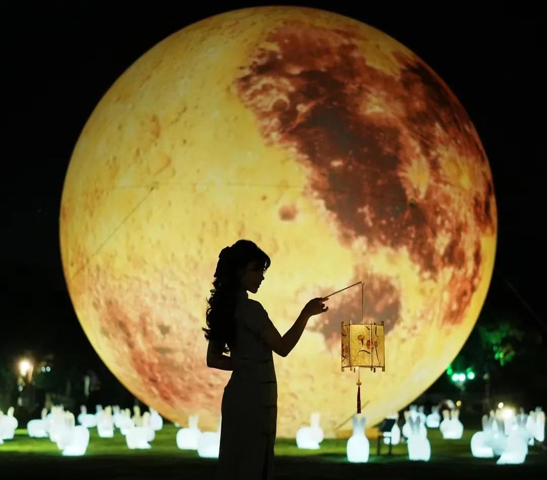 巨型月亮氣模臨水而立,超級月亮散發(fā)微光寓意家庭團圓、和和美美,就在今晚來和月亮撞個滿懷吧!