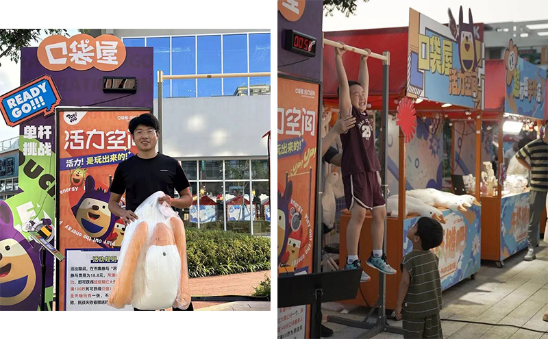 在旁邊的5號攤位“口袋屋活力空間”同樣熱度不減,5號攤位積極響應全民運動的號召,呼吁市民朋友到市集參與“吊單杠”挑戰(zhàn)活動,吊滿120秒超大只網(wǎng)紅大鵝就能抱回家!不管是健身達人還是運動小白都摩拳擦掌,大家都想一展身手。