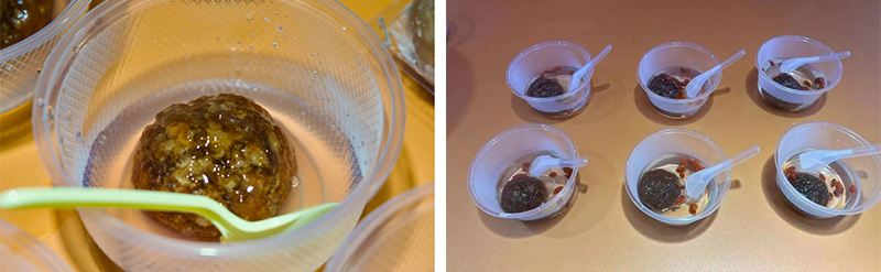 藕粉圓子細嫩彈舌,色澤透明呈深咖啡色,餡心用腌制的糖板油丁加以核桃仁、花生仁等果料混合制成,營養(yǎng)豐富、甜潤爽口,一口下去回味無窮。2號“尋味非遺 佳藕天成”售賣的是建湖特產(chǎn)藕粉圓子,作為鹽城人生活中是一種獨特情懷的美食,藕粉圓子既可作為時令小吃亦可作為筵席佳肴寓意美好,快來嘗嘗鮮吧!