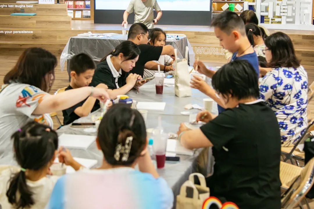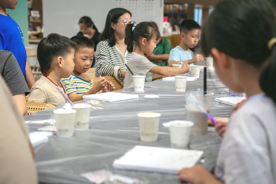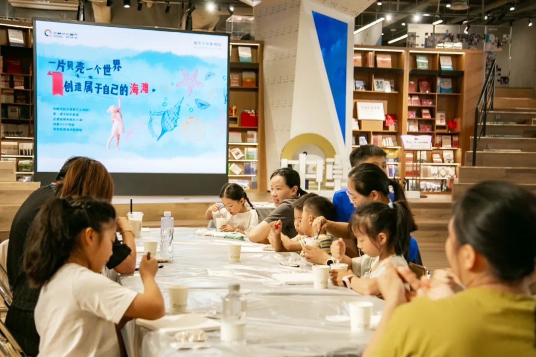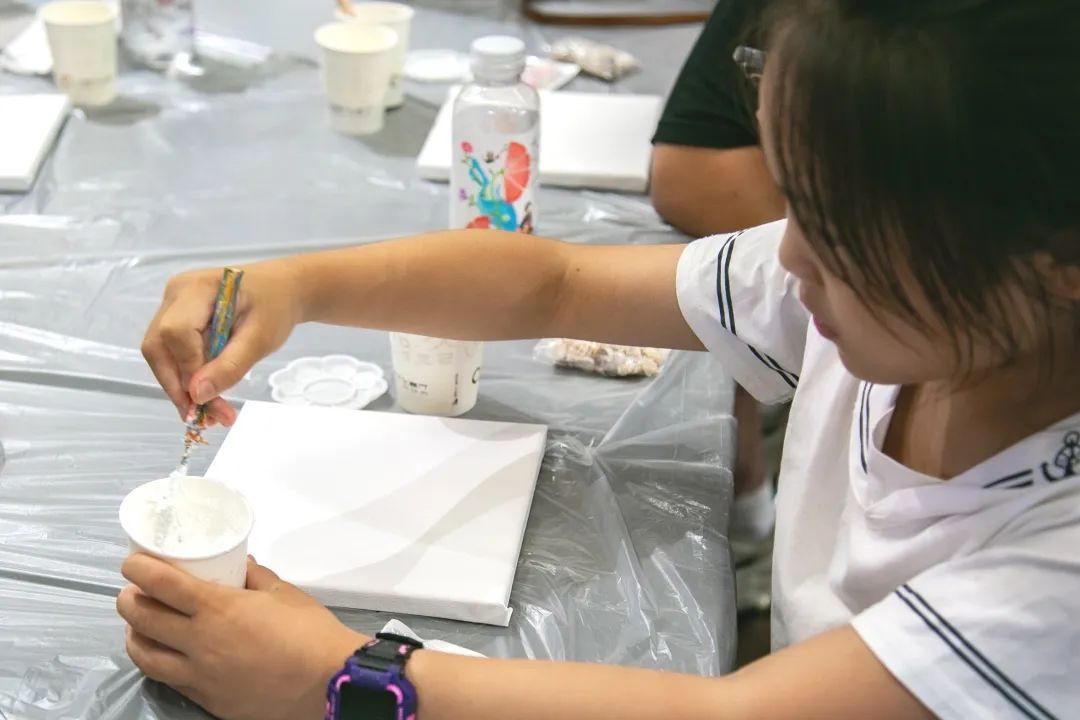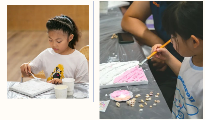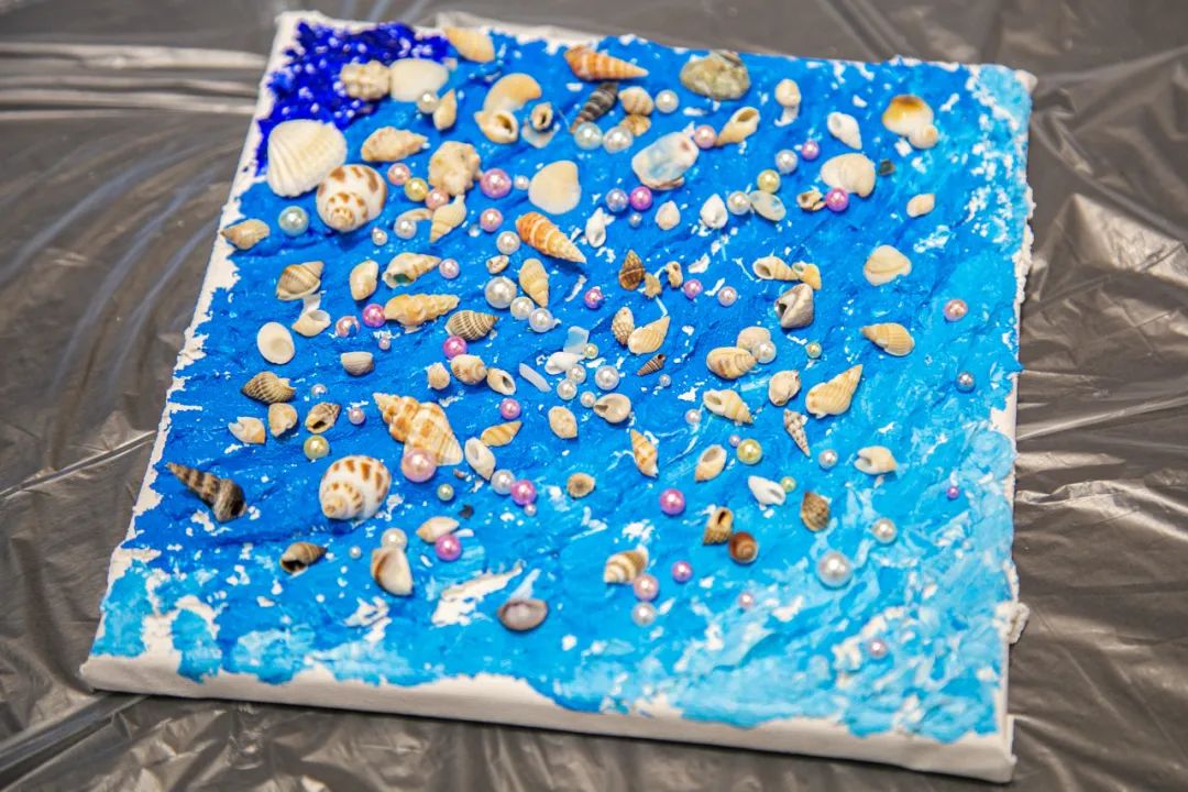 大家構(gòu)思分布海浪的結(jié)構(gòu)和位置,小心翼翼的用鉛筆在畫板上畫出大致輪廓,再將石英砂混入丙烯顏料增加肌理感。小巧的刮刀變成了靈活的畫筆,大家用不同手法“刮”出各種縱橫交錯、凹凸不平的紋理,最后再搭配上貝殼以及珍珠裝飾,一幅幅精美獨特的作品由此誕生。