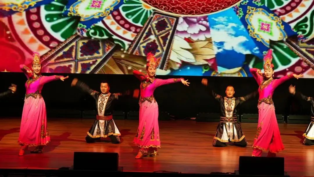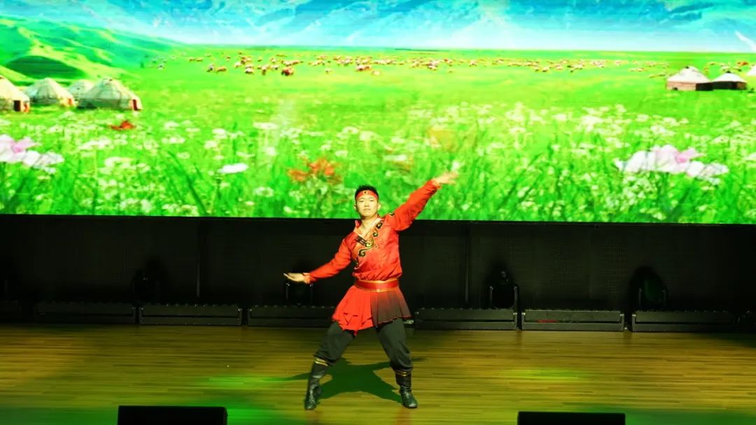 扭肩、甩胯、甩臂、拍胸......伴隨著鏗鏘有力的擊鼓聲,文藝匯演拉開序幕。新疆民族男子舞蹈《盛世貝倫》《情系草原》《黑走馬》節(jié)奏明快、舞姿灑脫,充滿張力,令人熱血沸騰,臺下的觀眾不禁跟著一起搖動身體,拍打節(jié)拍,心兒早已飛向廣闊的草原。
