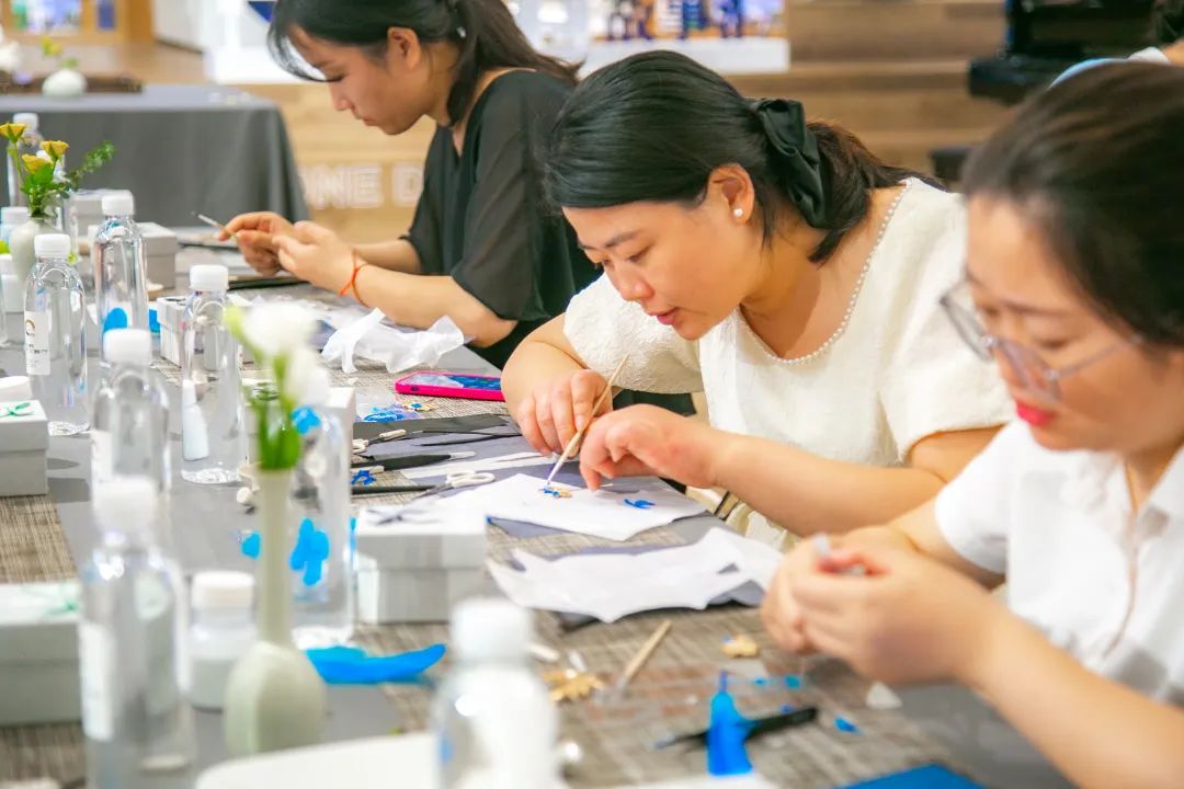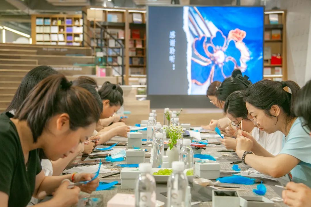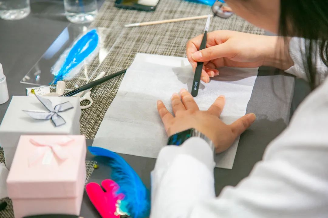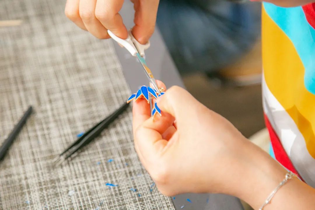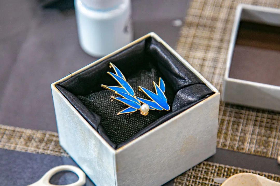 平穩(wěn)的案板,端方的紙筆,精細的工具,大家在歡聲笑語中,邊學(xué)邊做邊交流,描、剪、填、粘、鑲......每個步驟都大家全神貫注、小心翼翼、精益求精,好像一位位技藝嫻熟的工匠。不一會兒,巧手“工匠”們精心制作的點翠胸針就完成了,在紛繁復(fù)雜的工藝之下,一件件精美的作品宛若一只只翩然起舞的藍蝶、展翅欲飛的青鳥,凝結(jié)著大家勞動的愉悅和美的創(chuàng)造,大家在完成作品的同時,對傳統(tǒng)非遺文化點翠技藝也有了更深的感知。