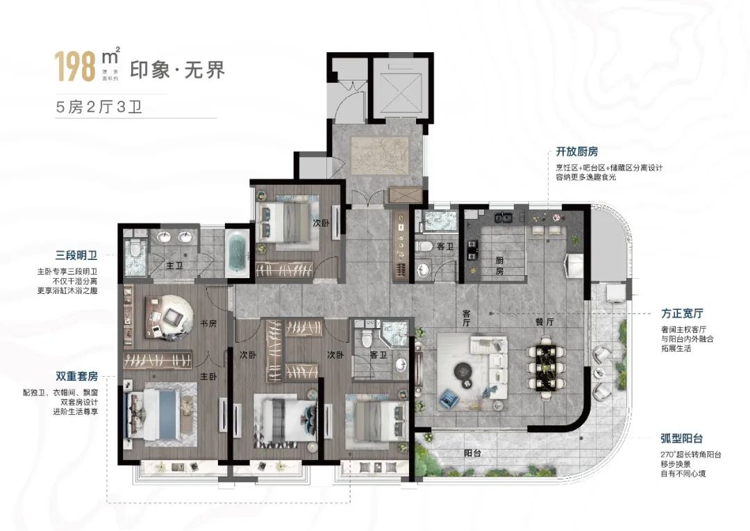 開放雙廚+方正雙廳+270°弧形陽臺