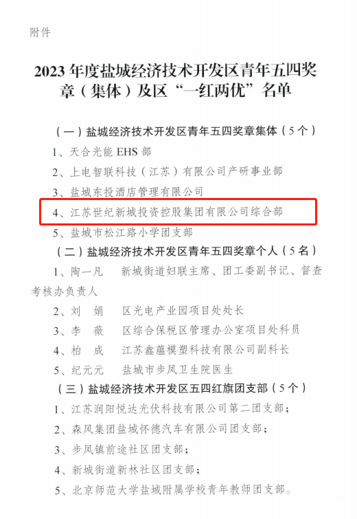 近日,鹽城市總工會(huì)下發(fā)《關(guān)于表彰鹽城市女職工先進(jìn)集體和先進(jìn)個(gè)人的決定》,鹽城經(jīng)濟(jì)技術(shù)開發(fā)區(qū)團(tuán)工委《關(guān)于公布 2023 年鹽城經(jīng)濟(jì)技術(shù)開發(fā)區(qū)青年五四獎(jiǎng)?wù)?集體)、五四紅旗團(tuán)支部(總支)、優(yōu)秀共青團(tuán)員、優(yōu)秀共青團(tuán)干部名單的通知》,表彰了集團(tuán)一批先進(jìn)集體和個(gè)人。