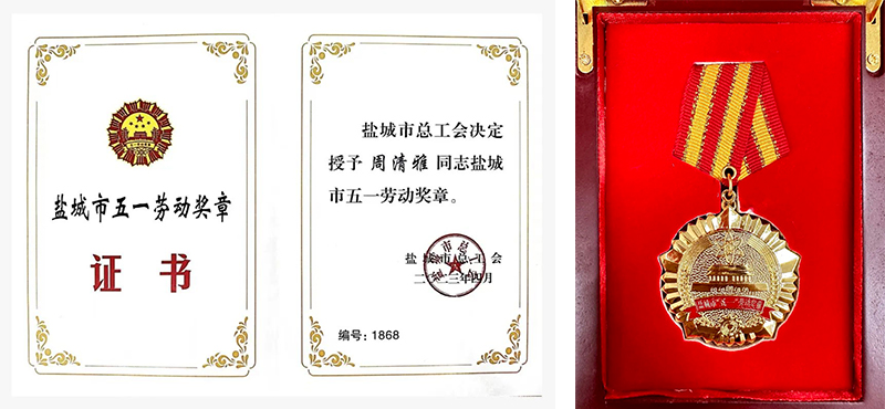 周清雅獲鹽城市五一勞動(dòng)獎(jiǎng)?wù)?、鹽城經(jīng)開區(qū)優(yōu)秀團(tuán)干部