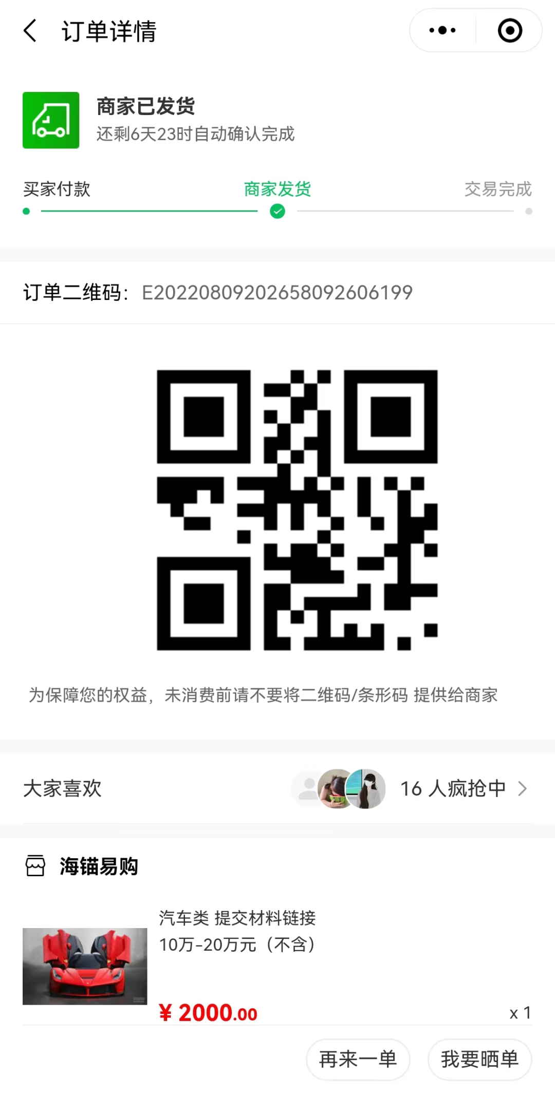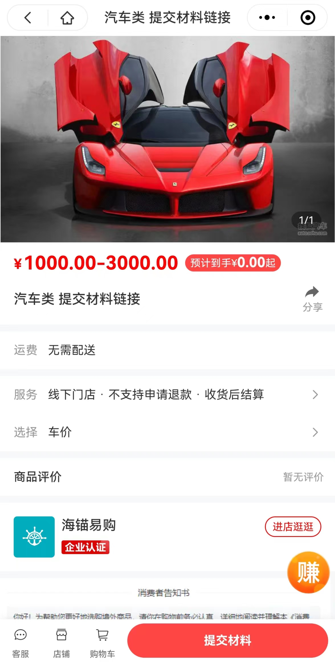 1、完成購車、獲取到正式牌照或臨時牌照后,掃描平臺方提供給商戶的二維碼,點擊“提交材料”。