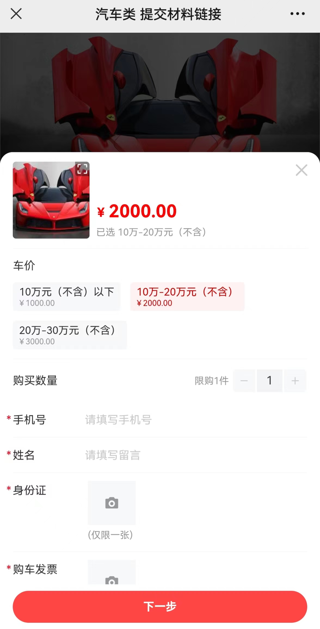 2、按照票面金額(不含稅價)選取車價區(qū)間,填寫手機號碼、姓名,上傳身份證照片、購車發(fā)票照片、車輛完稅證明照片、行駛證照片,點擊“下一步”。