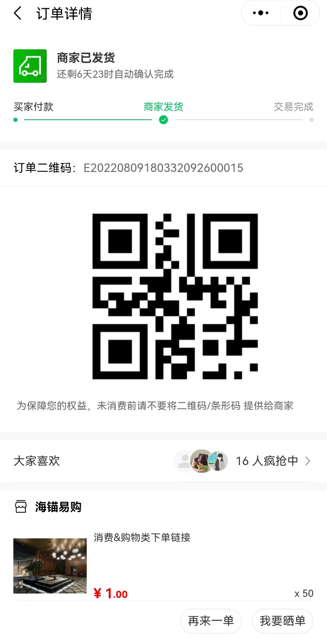 1、在商家消費后,掃描平臺方提供給商戶的二維碼,點擊“立即購買”。