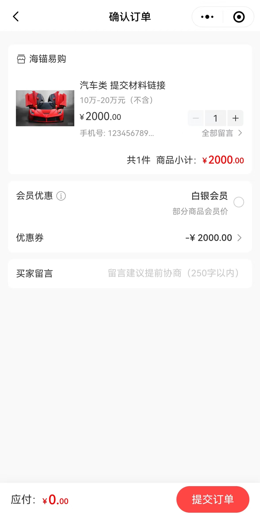 例如,車價在10萬-20萬元(不含增值稅)的車輛,可抵扣2000元,如用戶已領(lǐng)取到2000元汽車現(xiàn)金抵用券,提交完材料后實際應付金額應為0元(如不為0元請勿提交訂單)。