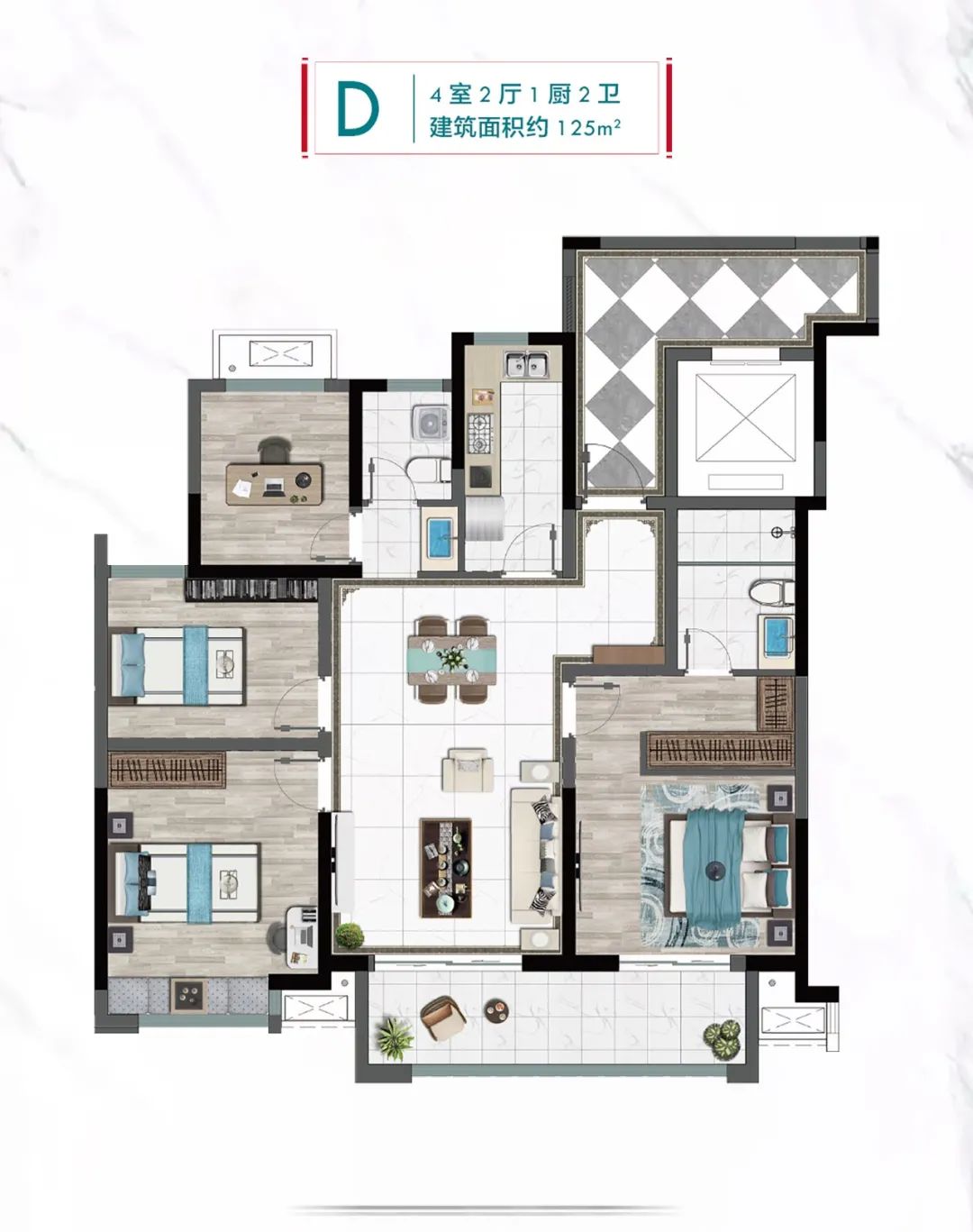 建面約125、138㎡四室兩廳兩衛(wèi)