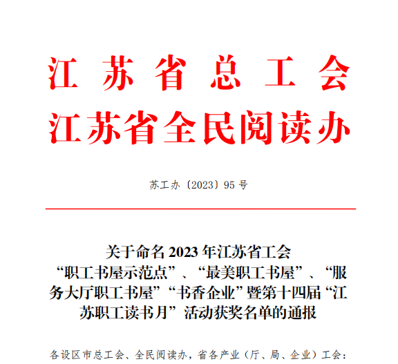喜訊!集團(tuán)榮獲2023年江蘇省工會(huì)“職工書(shū)屋示范點(diǎn)”榮譽(yù)稱(chēng)號(hào)!