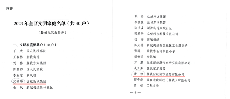 近日,區(qū)精神文明建設(shè)指導(dǎo)委員會評選出了40戶2023年全區(qū)文明家庭,集團(tuán)融資部沈祎瑋家庭被評為“文明家庭標(biāo)兵戶”,酒店公司唐靜家庭被評為“文明家庭”。