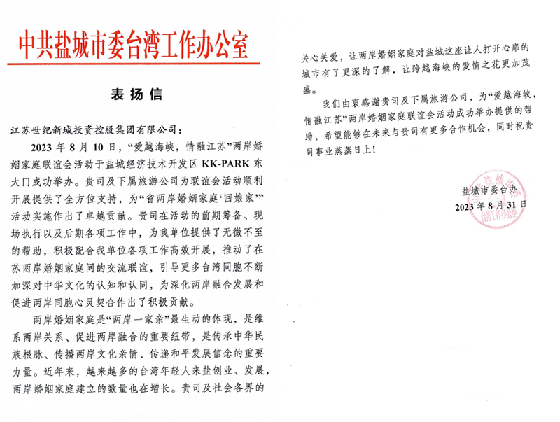 歡聚一堂,共敘情誼。8月10日,“愛越海峽 情融江蘇”兩岸婚姻家庭江蘇行暨第二屆全省兩岸婚姻家庭交流聯(lián)誼活動(dòng)在鹽城經(jīng)開區(qū)KK-PARK國(guó)際街區(qū)圓滿落幕,讓百余位兩岸婚姻家庭成員看到了鹽城的熱情和活力。近日,集團(tuán)收到來自中共鹽城市委臺(tái)灣工作辦公室的感謝信,對(duì)活動(dòng)籌備支持和圓滿舉辦表示感謝。走進(jìn)KK-PARK國(guó)際街區(qū),燈光隨著音樂跳躍、閃耀的福星現(xiàn)場(chǎng)、充滿煙火氣息的東市市集、浪漫旋轉(zhuǎn)的摩天輪......近年來,世紀(jì)新城集團(tuán)在區(qū)黨工委、管委會(huì)的正確領(lǐng)導(dǎo)下,勇挑韓風(fēng)國(guó)際文化名城建設(shè)主力軍重?fù)?dān),文旅融合展現(xiàn)蓬勃活力,走出一條獨(dú)特的文旅融合新道路。