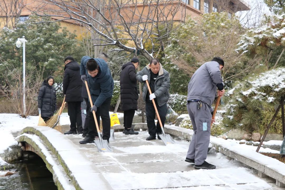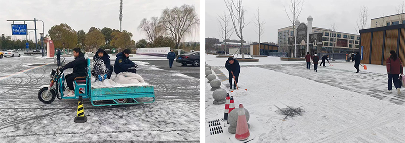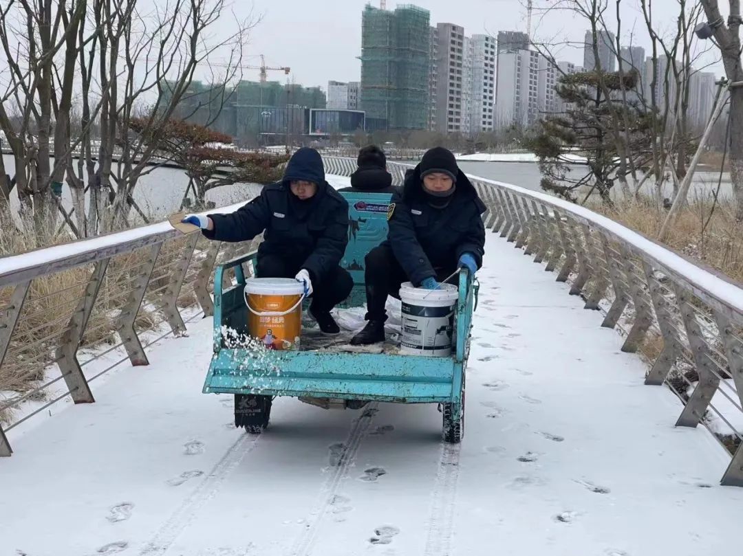 在東湖國際、東大門KK-PARK、中韓迎賓苑、中韓文化客廳、新嘉源人才公寓等項目現(xiàn)場,大家個個干勁十足,清雪現(xiàn)場熱火朝天,鏟雪除冰行動有序地開展著。針對部分區(qū)域積雪厚、清理難的實際,大家分工負(fù)責(zé),先清后鏟,再撒鹽......大家鏟的鏟,撒的撒,配合默契,忙碌的身影,構(gòu)成了一道靚麗的風(fēng)景線。