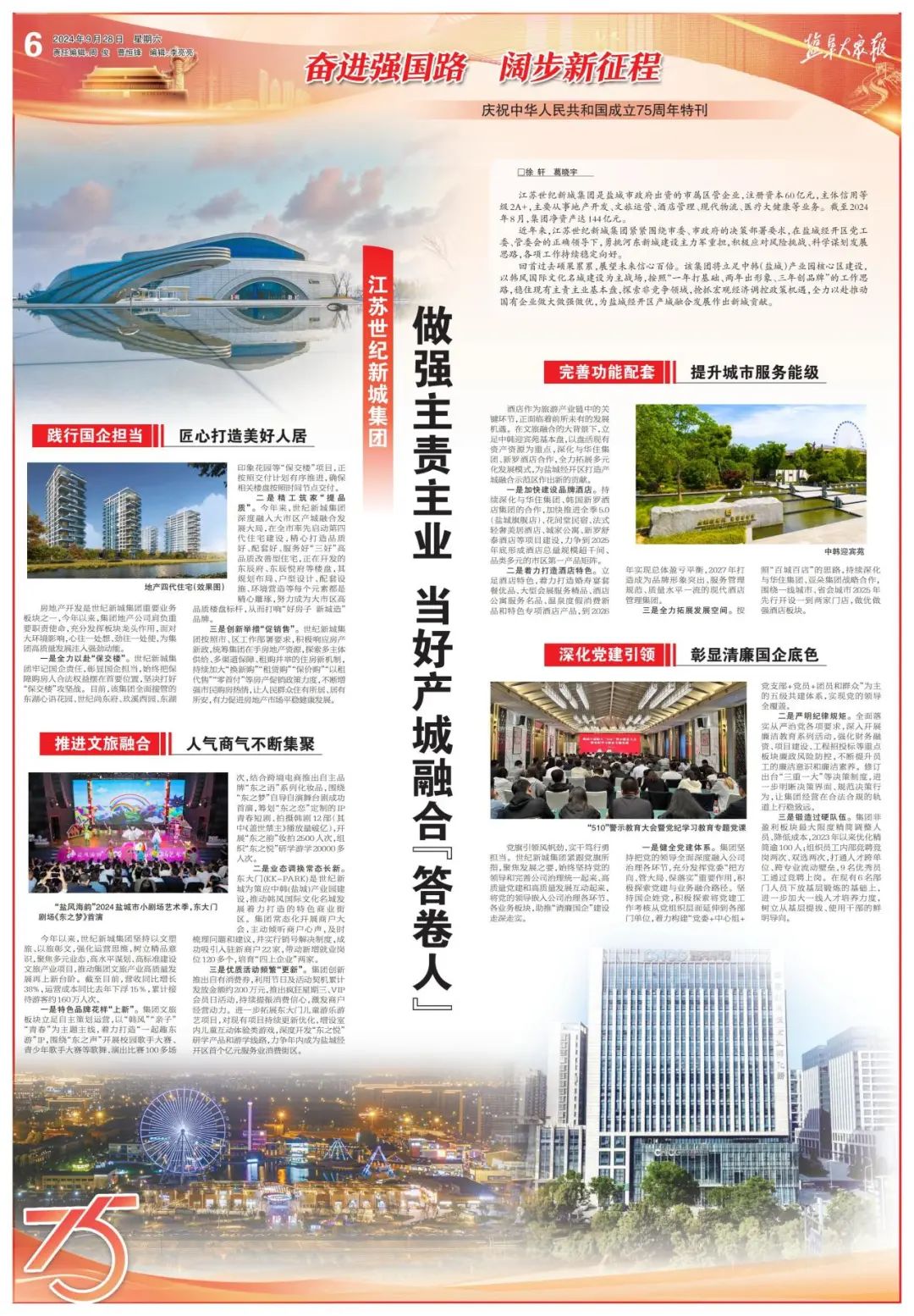 近日,鹽阜大眾報報業(yè)集團刊發(fā)了《奮進強國路 闊步新征程——慶祝中華人民共和國成立75周年特刊》,專版聚焦集團做強主責(zé)主業(yè),勇挑產(chǎn)城融合發(fā)展主力軍。