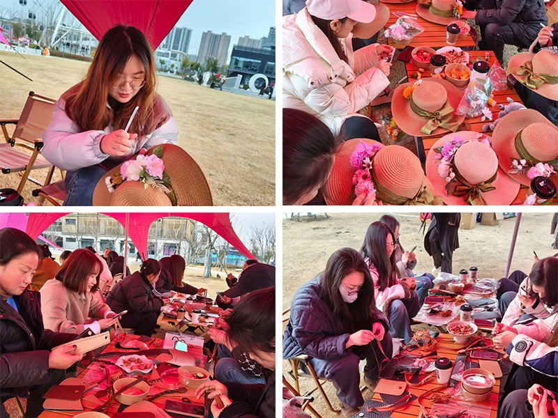 草坪手作充滿了創(chuàng)意與溫情,皮包 DIY 手作區(qū),心靈手巧的女員工在春風(fēng)的輕撫下,專注地將一片片材料,通過一針一線精心組合,把對生活的熱愛融入到手中的作品;花藝草帽 DIY 手作區(qū)同樣熱鬧非凡,草編與花藝在這里完美結(jié)合,一頂頂普通的草帽在巧手加持下,變成了獨一無二的時尚單品,綻放出別樣的美麗。大家相互交流制作心得,分享創(chuàng)意靈感,現(xiàn)場洋溢著溫馨與歡樂。