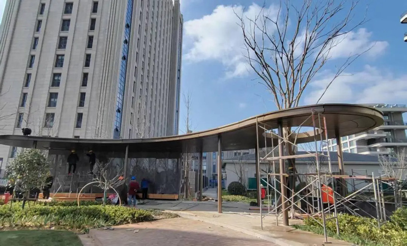 路面瀝青、PC磚、透水混凝土、塑膠運(yùn)動(dòng)場(chǎng)地已全部完成,工人精心裁剪、多點(diǎn)交匯的設(shè)計(jì)堪稱藝術(shù);廊架正在進(jìn)行最后的嚴(yán)格標(biāo)準(zhǔn)化安裝,確保結(jié)構(gòu)穩(wěn)固、焊縫嚴(yán)絲合縫。