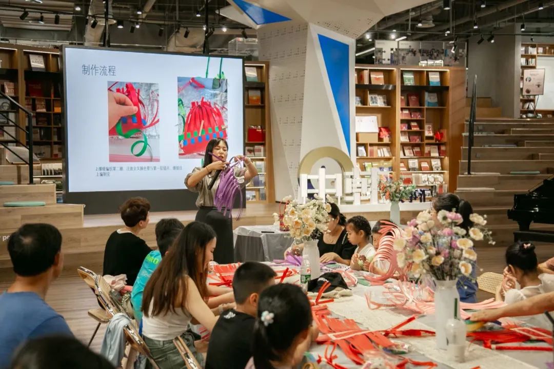 活動一開始,編織老師先向大家詳細(xì)介紹了竹編工藝的歷史源流、發(fā)展歷程以及傳承意義。隨后為大家講解竹編包的制作技巧,并演示竹編的編織技藝和手法。在老師的示范教學(xué)下,孩子和家長們一起制作起竹編包,只見一根根五顏六色的竹條在大手、小手中不斷游走,漸漸組成了小包模樣,成功的喜悅浮現(xiàn)在大家的笑顏中。
